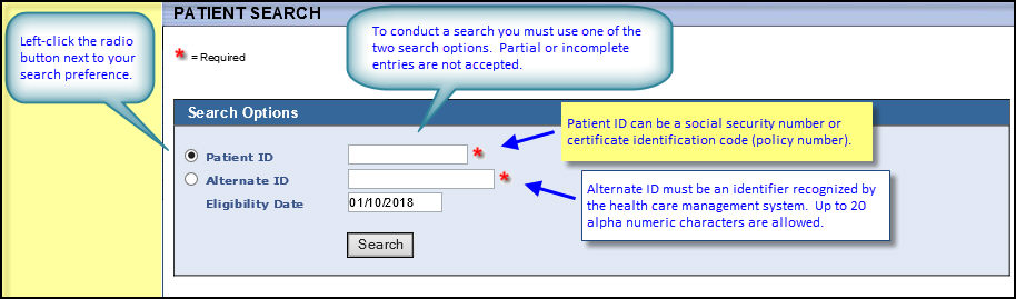 The Patient Search screen lets you access and review patient information. Search for the patient whose file you want to review using either the Member ID or Alternate ID.