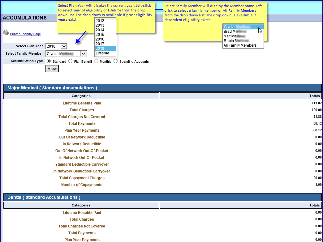 Options include each plan year for which the insured is tracked within the system and Lifetime. Lifetime is a total of all tracked accumulations for the specified family member type. |