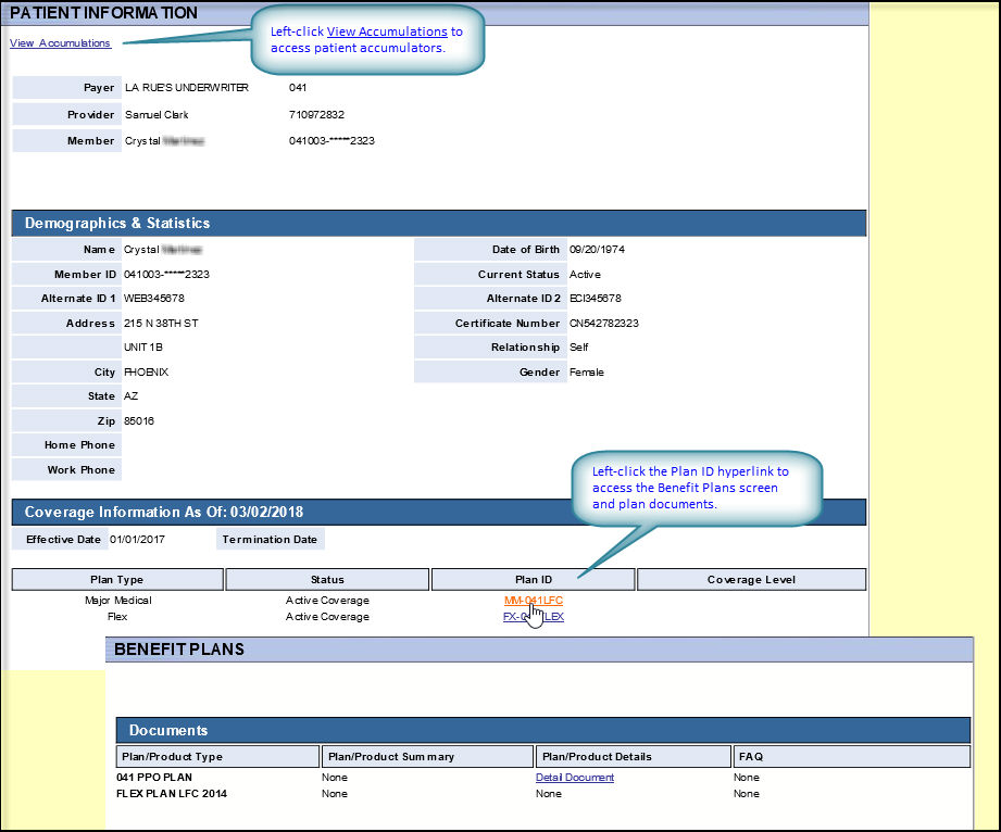 From the main Patient Information screen, you can also view the patient's benefit accumulations by clicking on the View Accumulations link.