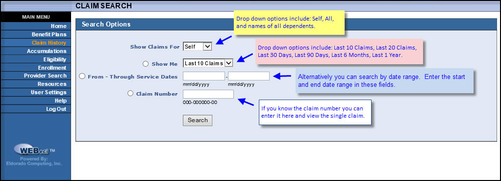 search claims for yourself and/or dependents by claim number, claim range, or date range.