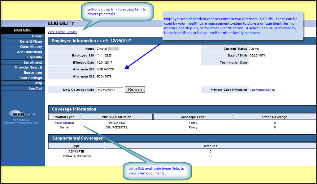 Your WEBeci Eligibility section provides you with a quick overview of your insurance status (active, terminated, etc.), your standard and supplemental insurance coverages (as appropriate), your family's insurance coverages (if applicable), and product and plan information.